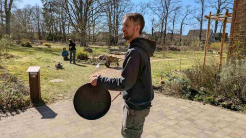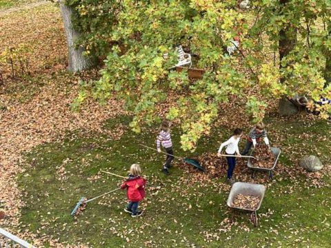 Ein großes Thema ist das Laub. Unsere geliebten alten Eichen und Buchen werfen davon Unmengen ab. Zwei Kompostboxen von je 3×2 m nehmen alles auf. Der fertige Kompost wird dann auf dem Grundstück wieder verteilt. Perfekte Kreislaufwirtschaft. Wer statt Spaten und Rechen lieber den Kochlöffel schwingt, tobt sich in der Küche aus und versorgt die hungrige Meute mittags mit einem super leckeren Essen. Angeblich lässt sich manch eine:r zur Gartenarbeit nur durch das Essen verführen.