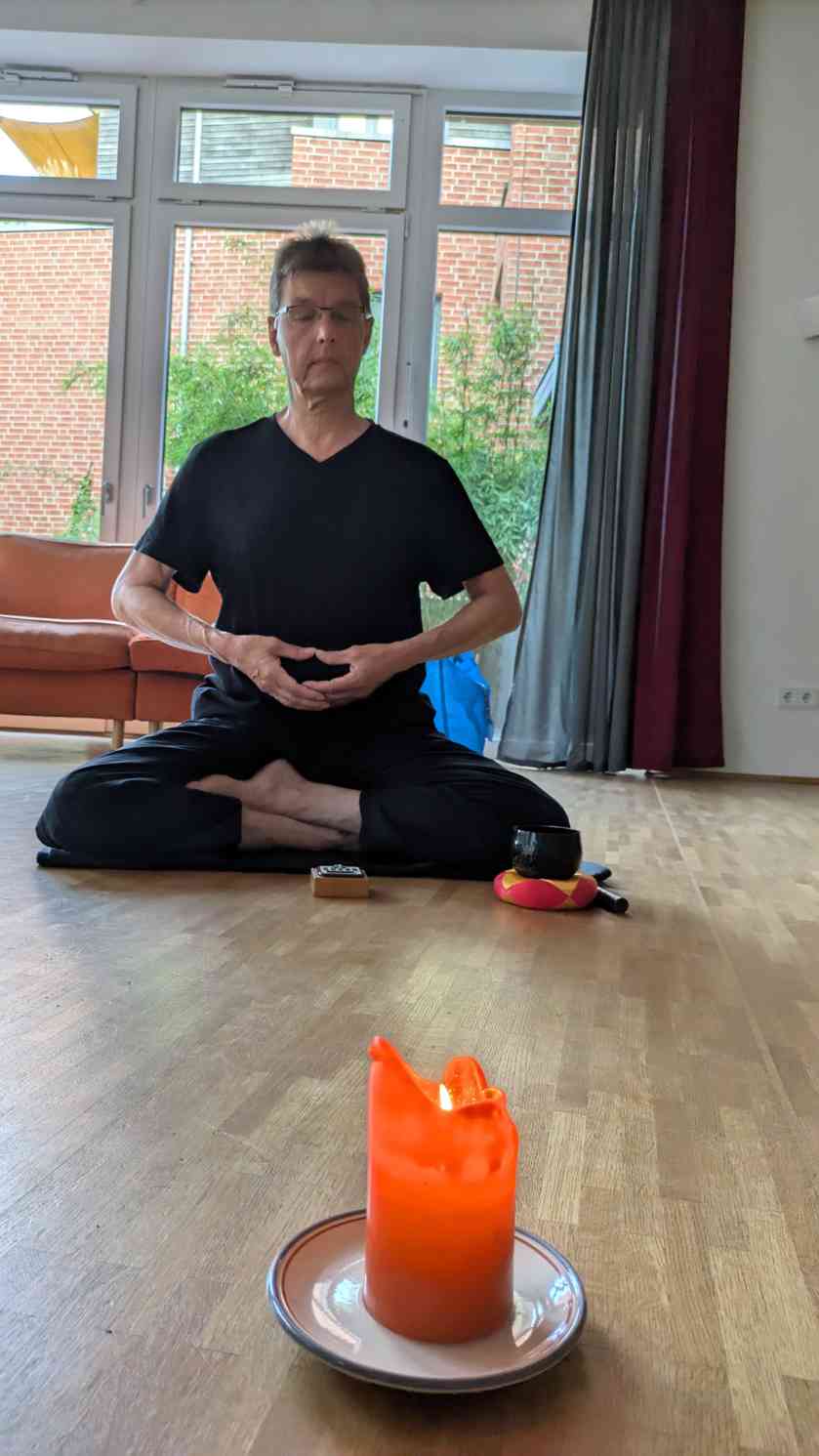 Mann meditierend im Lotussitz, vor ihm brennende Kerze